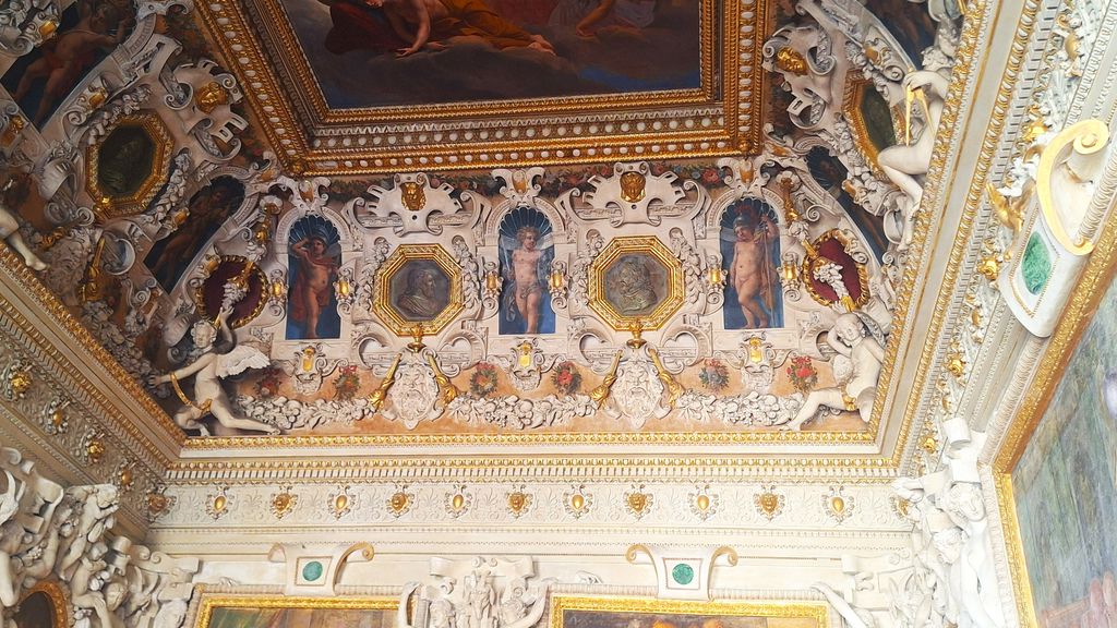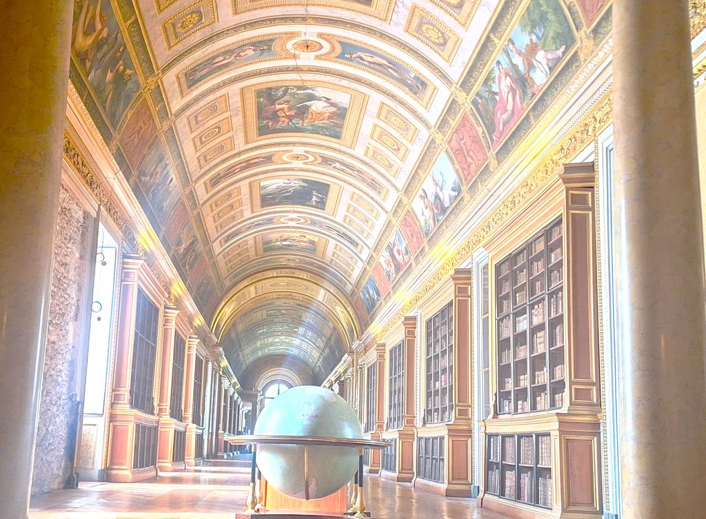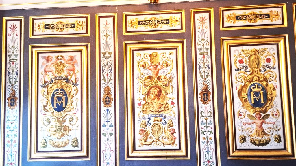 Pereții sunt acoperiți cu fresce în care alternanța ferestrelor și a lungilorlunete pictate creează un ritm vizual aproape muzical. Podeaua originală – din marmură și pietre de culori alternante – reflectă ușor lumina, adăugând profunzime întregului spațiu. Aceasta era sala în care curtea lui Henri al II-lea dansa, negocia și se privea cu ochi iscoditori sub masca festivităților oficiale. Nu e greu să îți imaginezi Caterina de Medici traversând acest spațiu, cu ochii mereu deschiși și inima mereu la calcul.