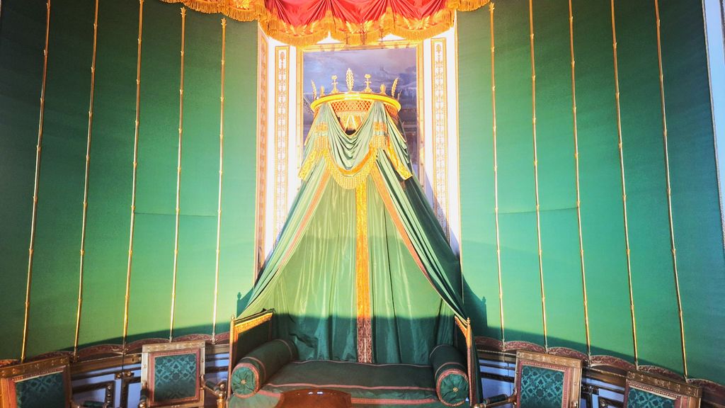 Dormitorul imperial domină sala prin baldachinul tronului, înalt și solemn, cu draperii de mătase imperial violet și aur – culorile lui Napoleon, culorile pe care le-a ales deliberat pentru a marca ruptura față de albastrul regal al Bourbonilor. Patul, masiv și sever, nu pare conceput pentru odihnă, ci pentru reprezentare. Napoleon dormea puțin și rău, iar asta se simte cumva în severitatea mobilierului.