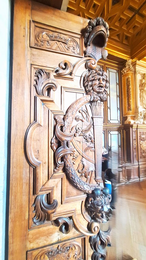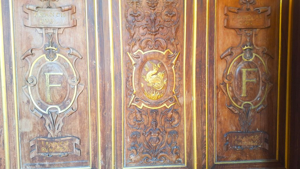 Marinela ne-a oprit în fața mai multor panouri și a decodat pentru noi simbolistica ascunsă în spatele aparențelor decorative. Un amănunt pe care nu îl găsești în ghidurile obișnuite: inițiala „F” a lui Francisc I apare repetitiv în decor, uneori entrelacé cu salamandrul – emblema sa heraldică. Salamandrul, despre care se credea în Evul Mediu că trăiește în foc fără să ardă, era alegoria perfectă pentru un rege care se vedea pe sine ca protector al culturii și al rațiunii în mijlocul barbariei.