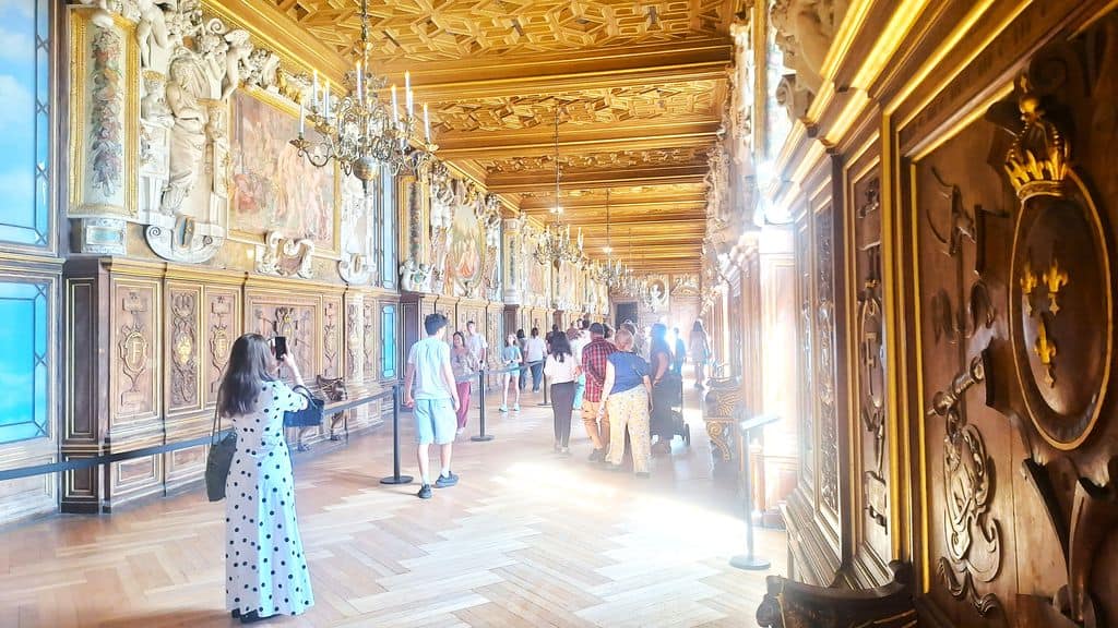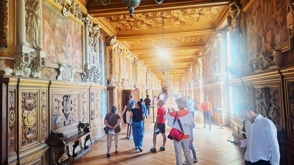 Primul lucru pe care îl observi când intri în Galeria Francisc I este lumina. Ferestrele înalte, dispuse pe toată lungimea galeriei, inundă spațiul cu o lumină egală, care cade exact cum trebuie pe panourile din lemn de nuc sculptat și pe frescele de deasupra. Construită între 1528 și 1540, galeria are aproximativ 60 de metri lungime și a servit inițial drept legătură acoperită între apartamentele regale și capelă – o soluție practică, transformată prin geniu artistic în ceva ce nu mai existase până atunci în Franța.