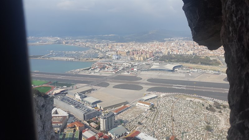 Aeroportul Gibraltar (GIB) are curse directe din Londra (British Airways și easyJet) și din Manchester. Din România, ajungi prin escală la Londra, Madrid sau Málaga. Aeroportul este minuscul și celebru pentru o anomalie arhitecturală: pista se intersectează cu bulevardul principal al orașului, astfel că atunci când aterizează sau decolează un avion, barierele coboară și traficul rutier se oprește. Am sperat să prindem o aterizare — nu am avut norocul.