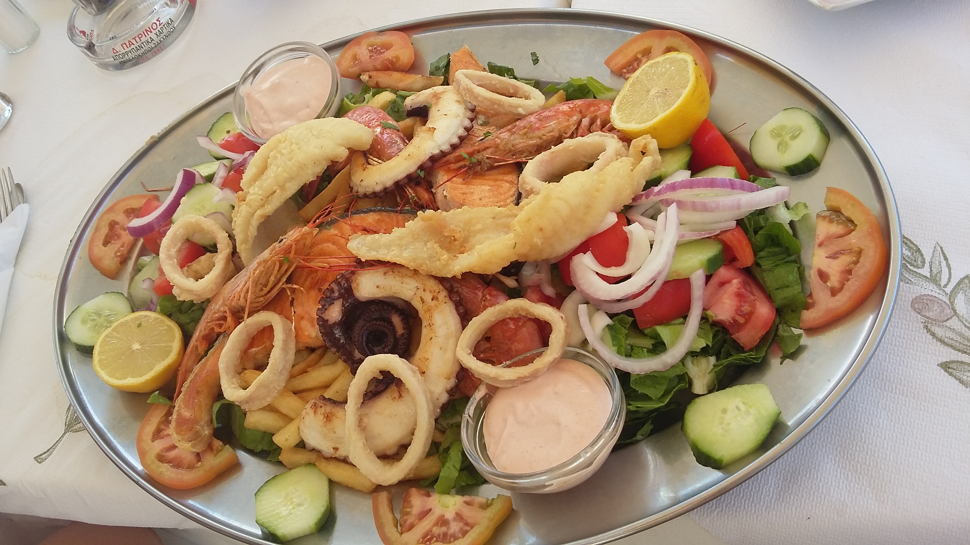 Laganas în timpul zilei arată ok — mai dezvoltată decât Alykanas, mai multe magazine și taverne, plajă lungă. Nu ne-a dat pe spate, dar am înțeles de ce e populară. Prânzul l-am luat la o tavernă lângă plajă — am comandat un platou de fructe de mare pentru două persoane, 40 EUR, nu la fel de bogat ca cel din Halkidiki de anul anterior, dar foarte gustos și meritat.