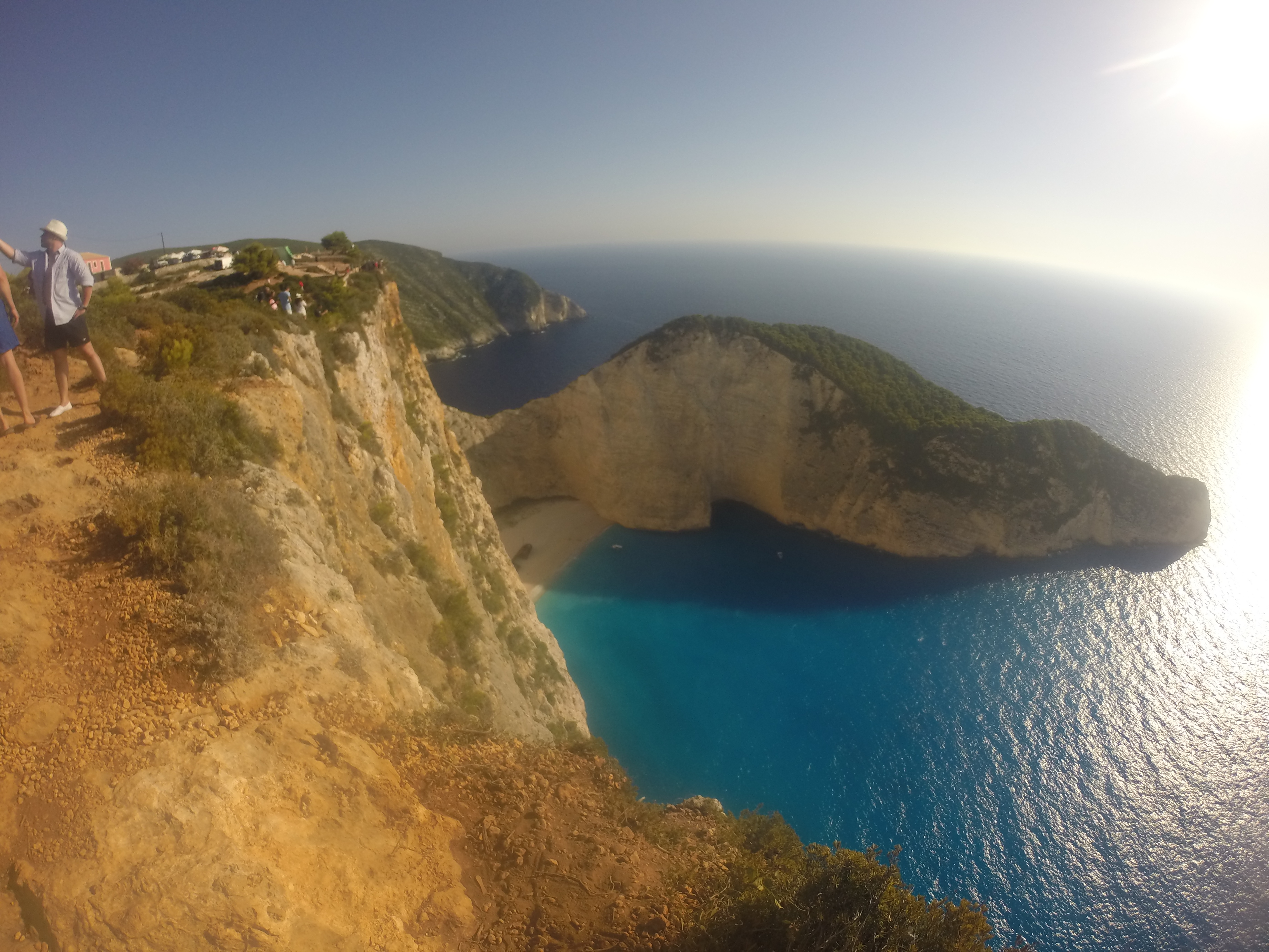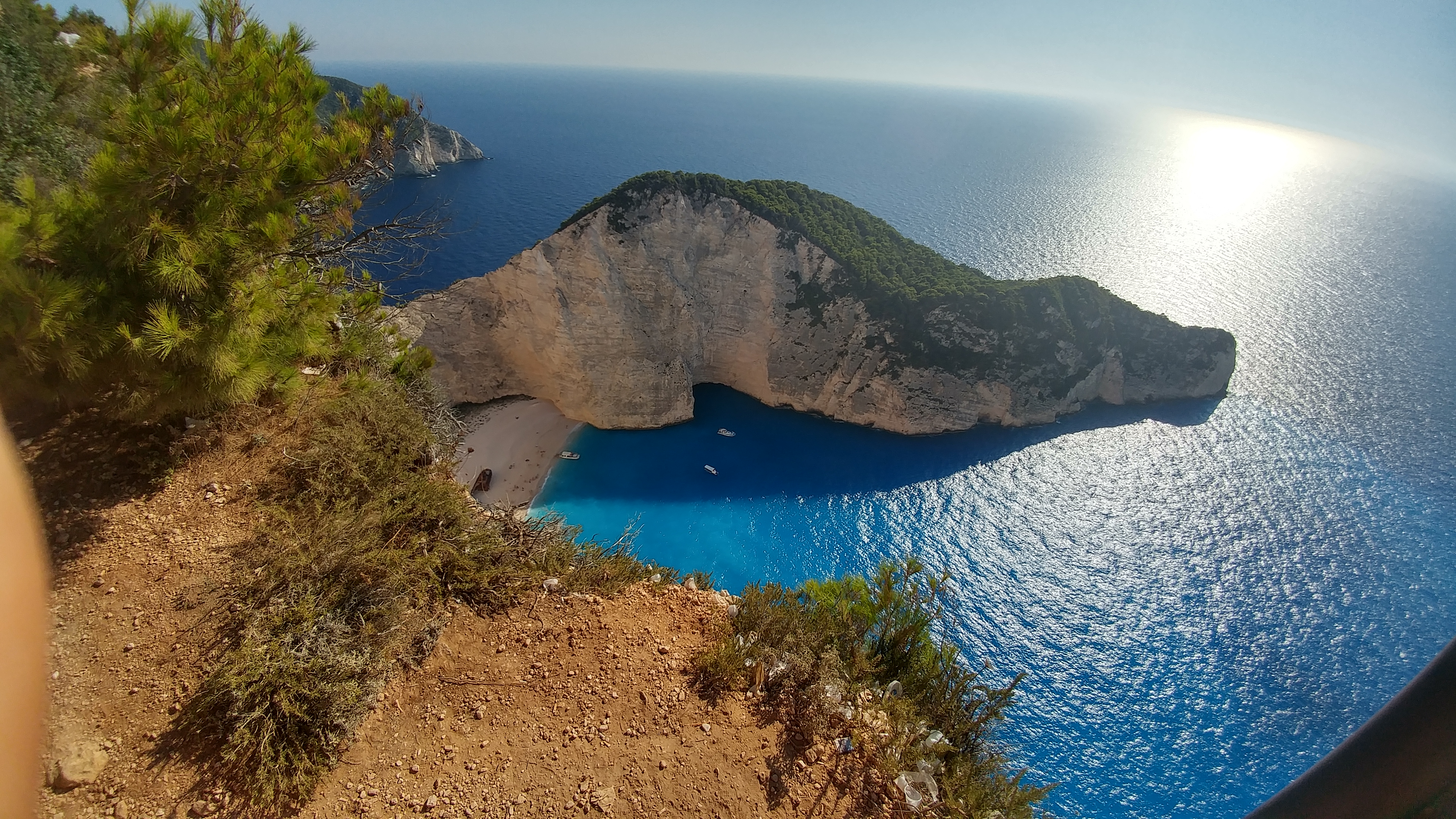 Navaggio de sus este o experiență separată și, pentru mine, poate chiar mai impresionantă decât plaja în sine. Pe stânca de deasupra golfului există un punct de belvedere, accesibil cu ATV-ul sau cu mașina pe un drum din interiorul insulei. Priveliștea este pur și simplu ireală — golful întreg se vede de sus, cu apa verde-turcoaz și epava minusculă în mijlocul lui. Singurul minus: stânca aceea m-a speriat destul de tare. Cred că acolo mi-am descoperit frica de înălțimi — aveam impresia că în orice moment se poate desprinde și cădea în mare. Nu s-a întâmplat, evident, și a meritat din plin.