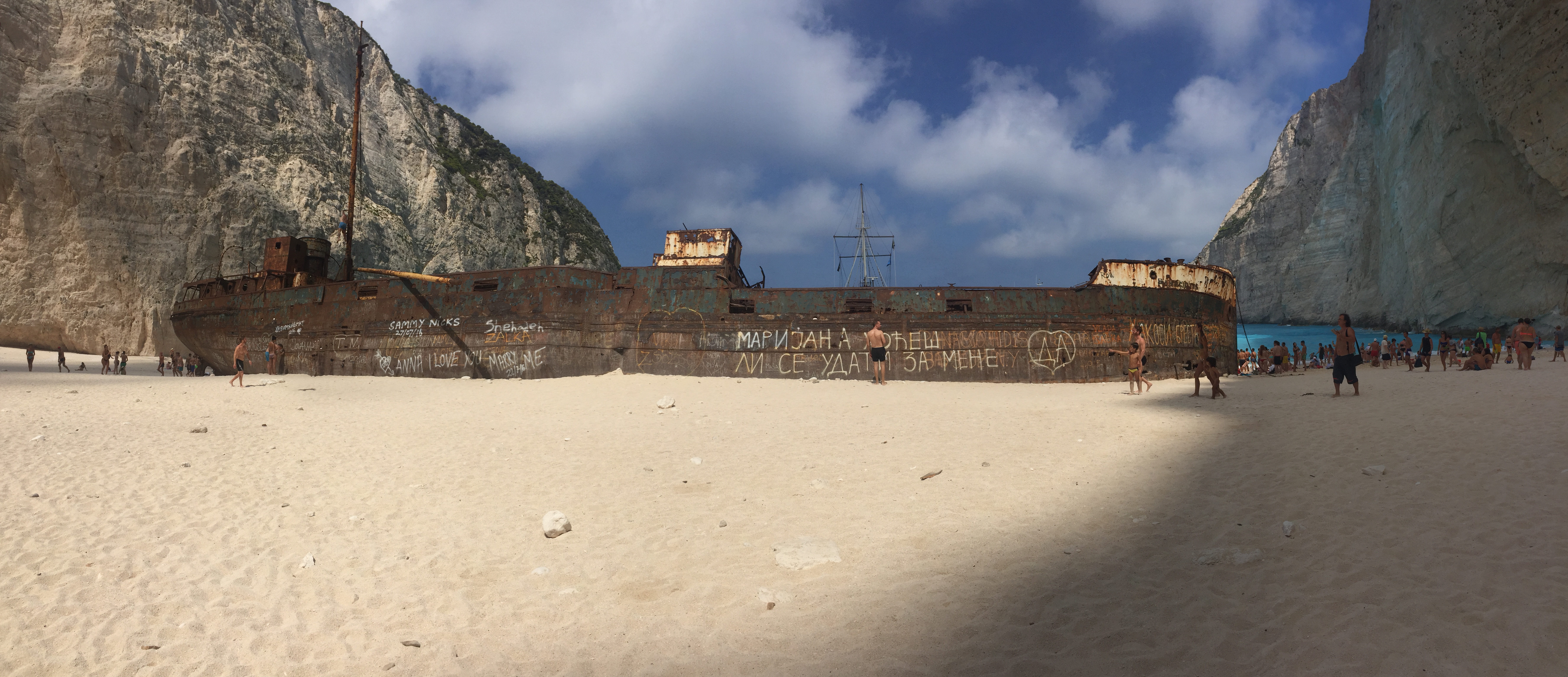Povestea epavei merită spusă: este vorba despre nava MV Panagiotis, eșuată în octombrie 1983 pe când transporta o încărcătură ilegală de țigări de contrabandă. Urmărită de Garda de Coastă greacă, vasul a eșuat în golful izolat care azi îi poartă informal numele. Epava a rămas acolo, mâncată de rugină și de vreme, transformându-se în timp în unul dintre cele mai fotografiate subiecte din lume.