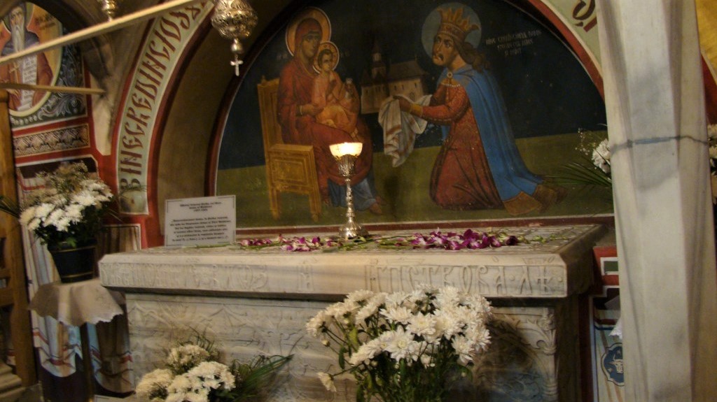 Inima întregului ansamblu. Voievodul care a domnit 47 de ani, a purtat 42 de războaie și a ridicat 26 de biserici își doarme somnul de veci într-un sarcofag de piatră, în naosul bisericii. Alături de el au fost înmormântate două dintre soțiile sale și doi dintre fiii săi, Bogdan și Petru. Simplu, solemn, copleșitor.