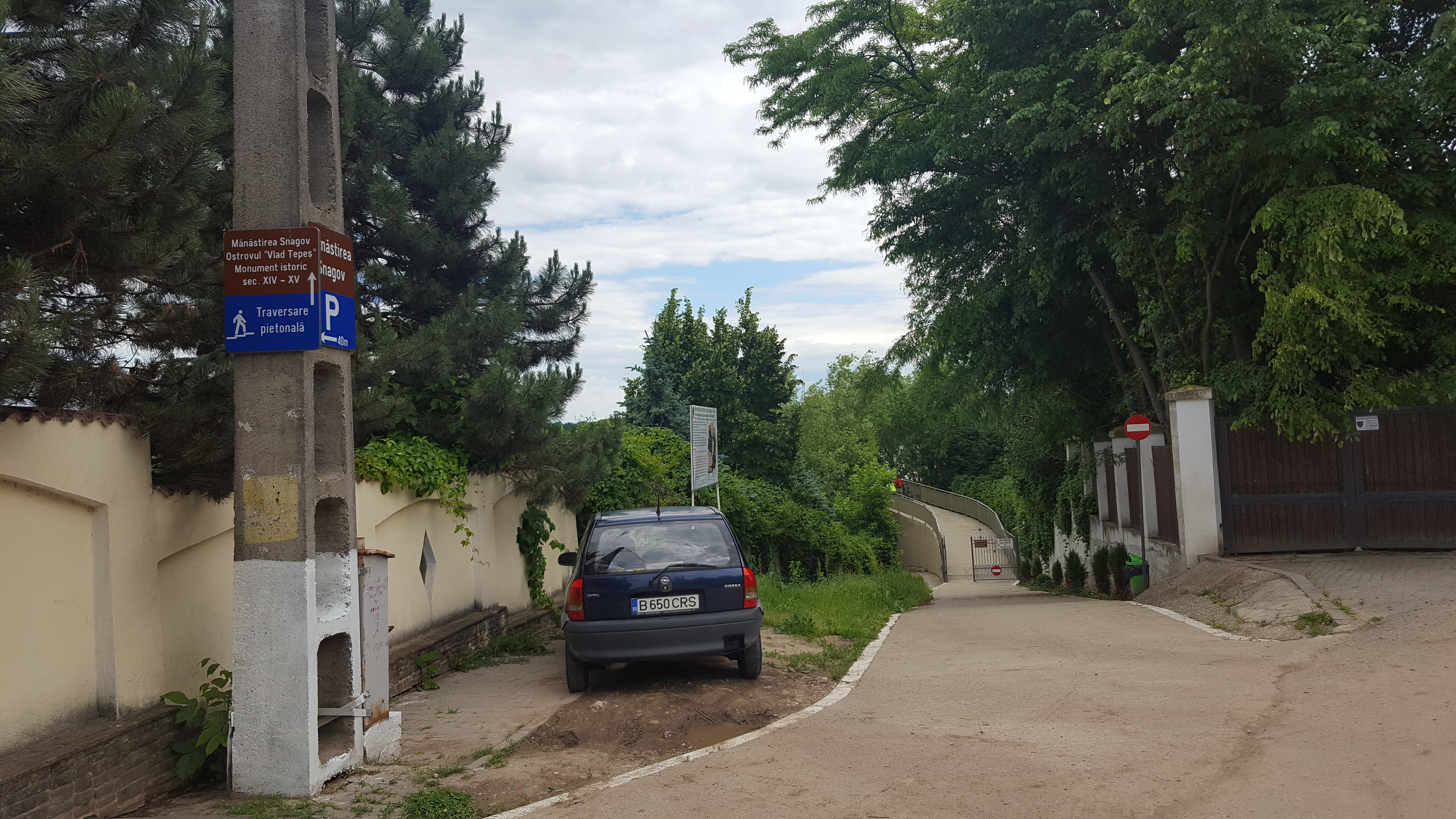 ❓ Cum ajung la Mănăstirea Snagov cu mașina? Pe DN1 până la km 35, apoi la dreapta pe DC2 – 9 km prin Ciofliceni și Ghermănești până în Siliștea Snagovului. Parcare gratuită la capătul podului pietonal.