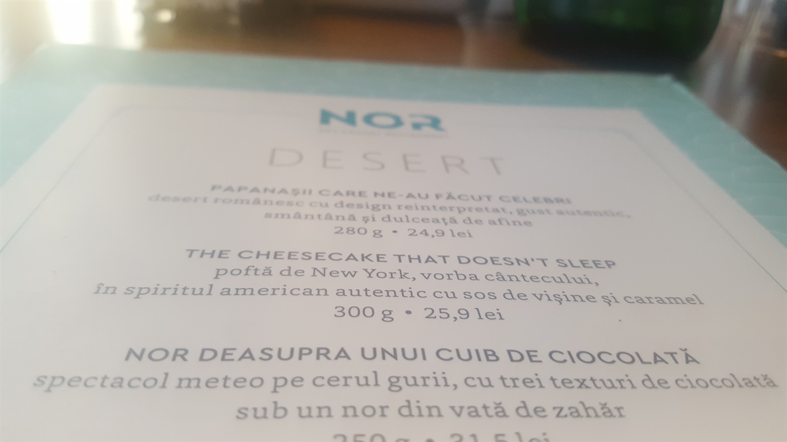 Pot spune ca și concluzie că mâncarea nu a fost extraordinară, poate chiar sub nivelul așteptărilor. Nu pot să mă laud că am frecventat multe restaurante de top, însă din simpla comparație cu un restaurant găsit oarecum din nimereală, la începutul anului în Plovdiv, nu pot să acord o notă foarte mare lui NOR – Sky Casual Restaurant. Atât felurile principale, cât mai ales deserturile au fost net superioare la restaurantul bulgăresc, fără să mai pun la socoteală faptul că am plătit aproape la jumătate de preț. Însă la NOR, fără îndoială, se plătește și locația, care merită cu prisosință!