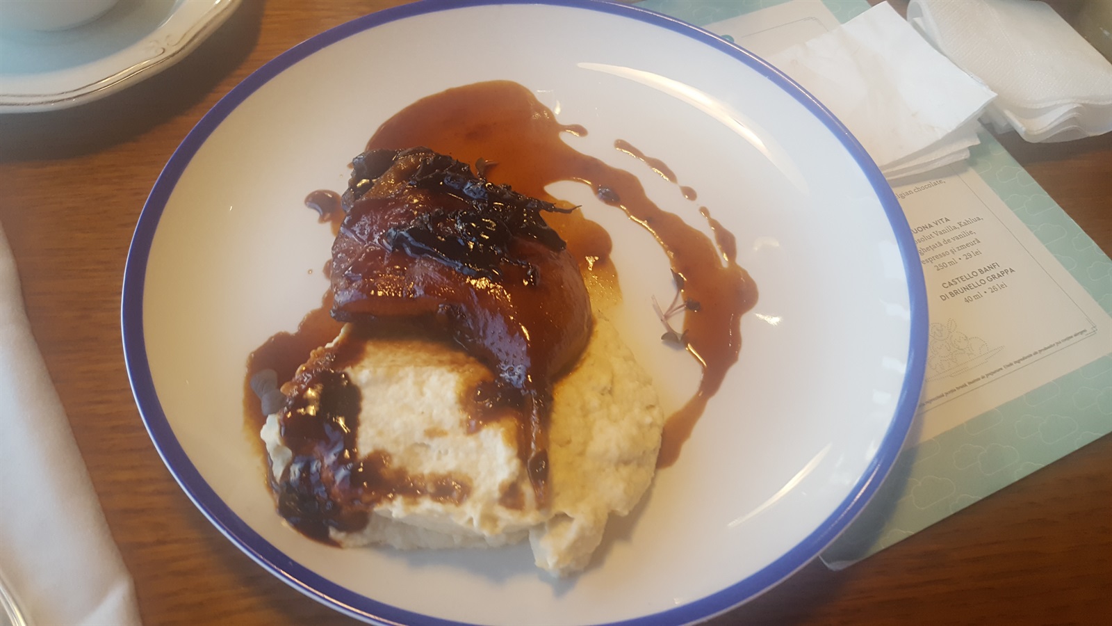Confitul de rață nu prea a fost pe gustul meu, dar trebuie să recunosc că a fost și vina mea..fiind gătit cu reducție de citrice, adică destul de dulce, chiar nu mergea cu ciocolata aceea caldă. Abia am mai simțit gustul de rață, care era în schimb bine făcut și foarte fragedă. Piureul de țelină nu a fost extraordinar, mi s-a părut fad, fără gust.
