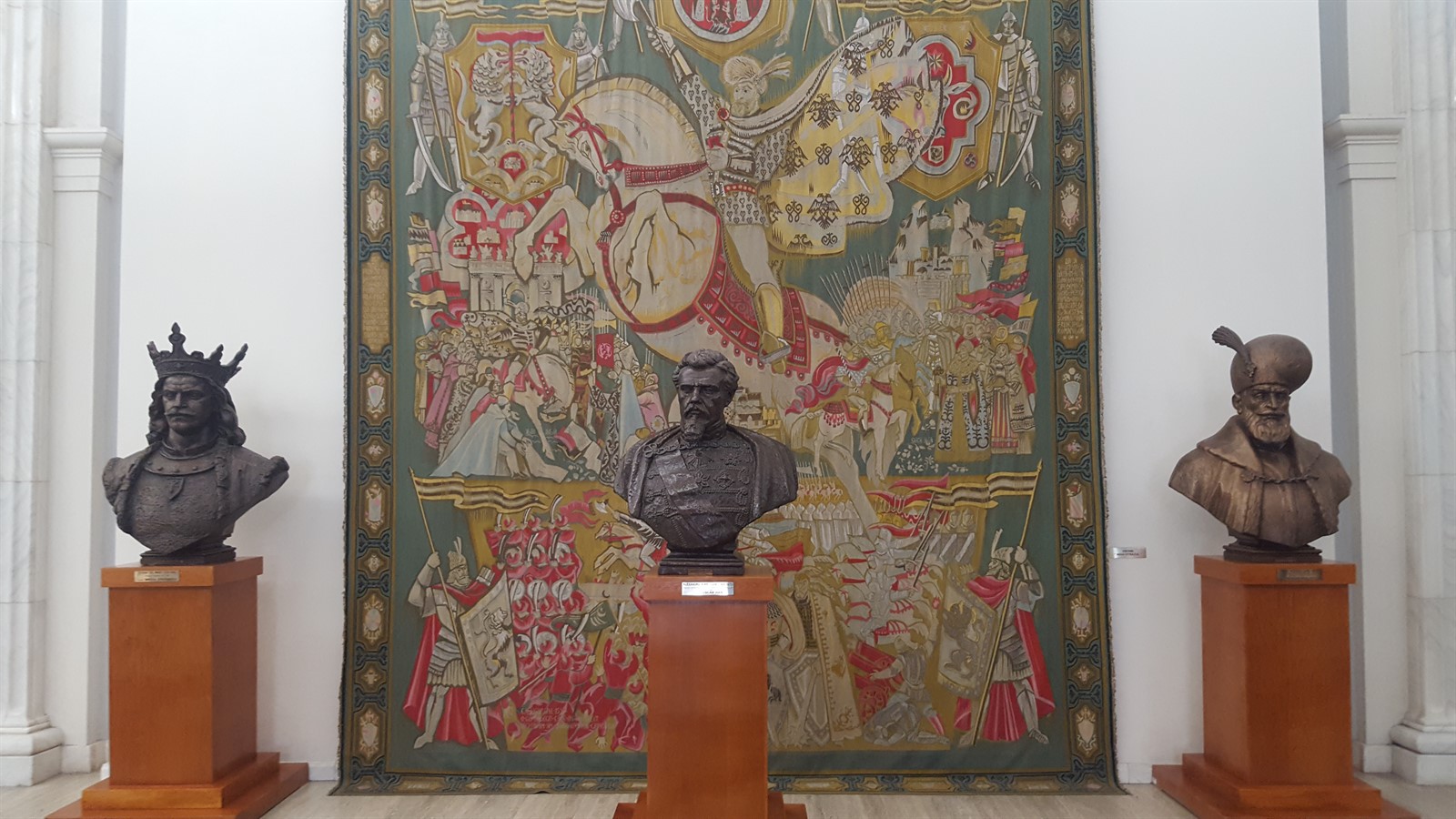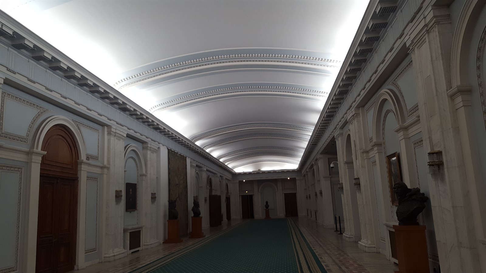 Vizita începe într-un salon lung, cu pereții din marmură, acoperiți din loc în loc cu tablouri, un tavan luminos, covor enorm, însă atenția este atrasă de busturile unor personalități istorice, precum Ștefan cel Mare, Mihai Viteazul și Alexandru Ioan Cuza.