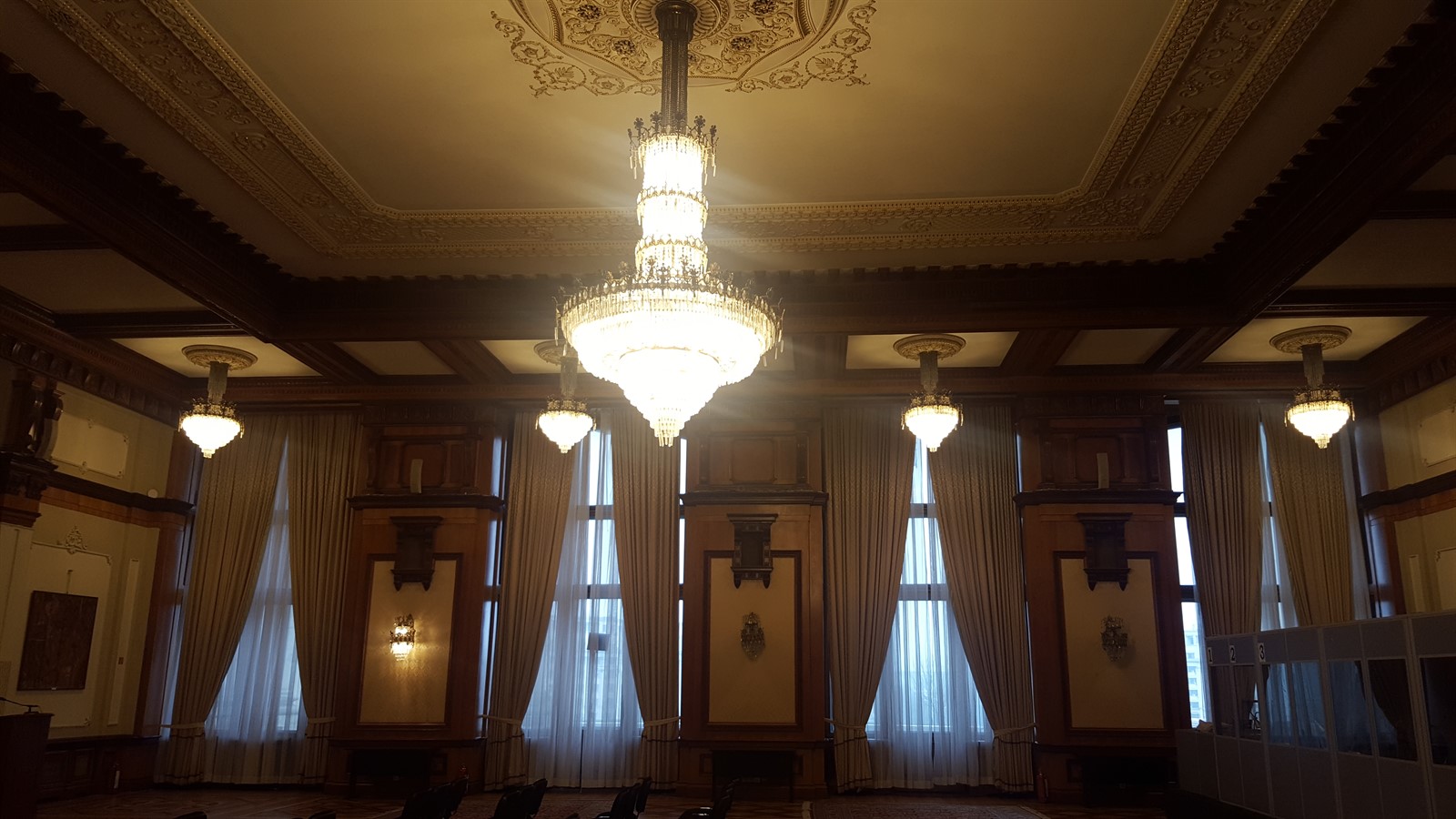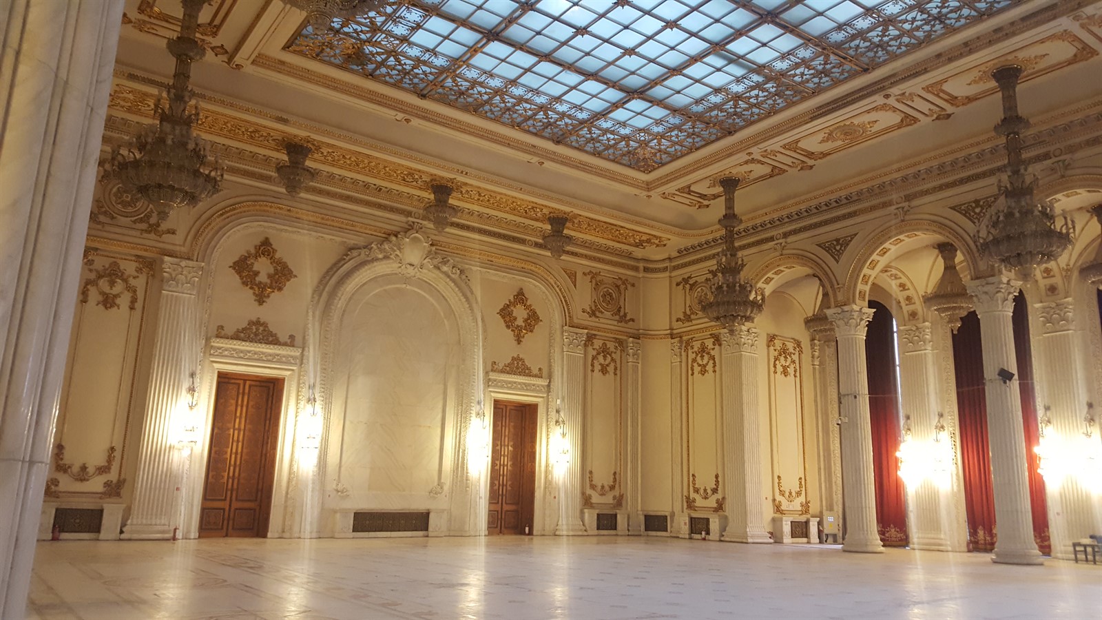 În această sală se regăsește singurul material din clădire care nu provine din România, anume lemnul de mahon, din care sunt făcute ușile. Acesta este un cadou primit de Nicolae Ceaușescu din partea președintelui Republicii Democrate Congo (pe atunci Zair).
