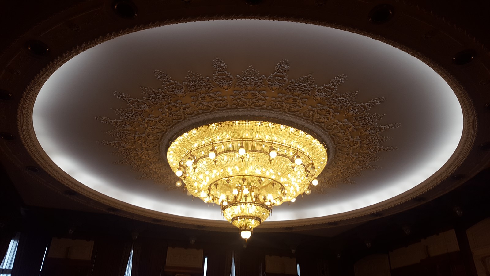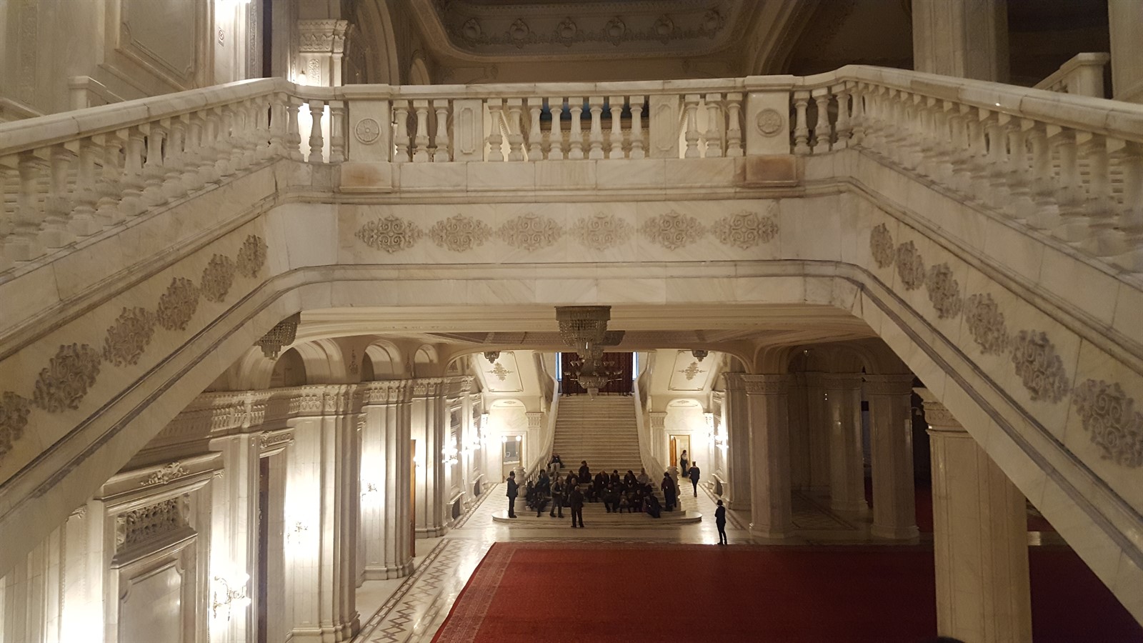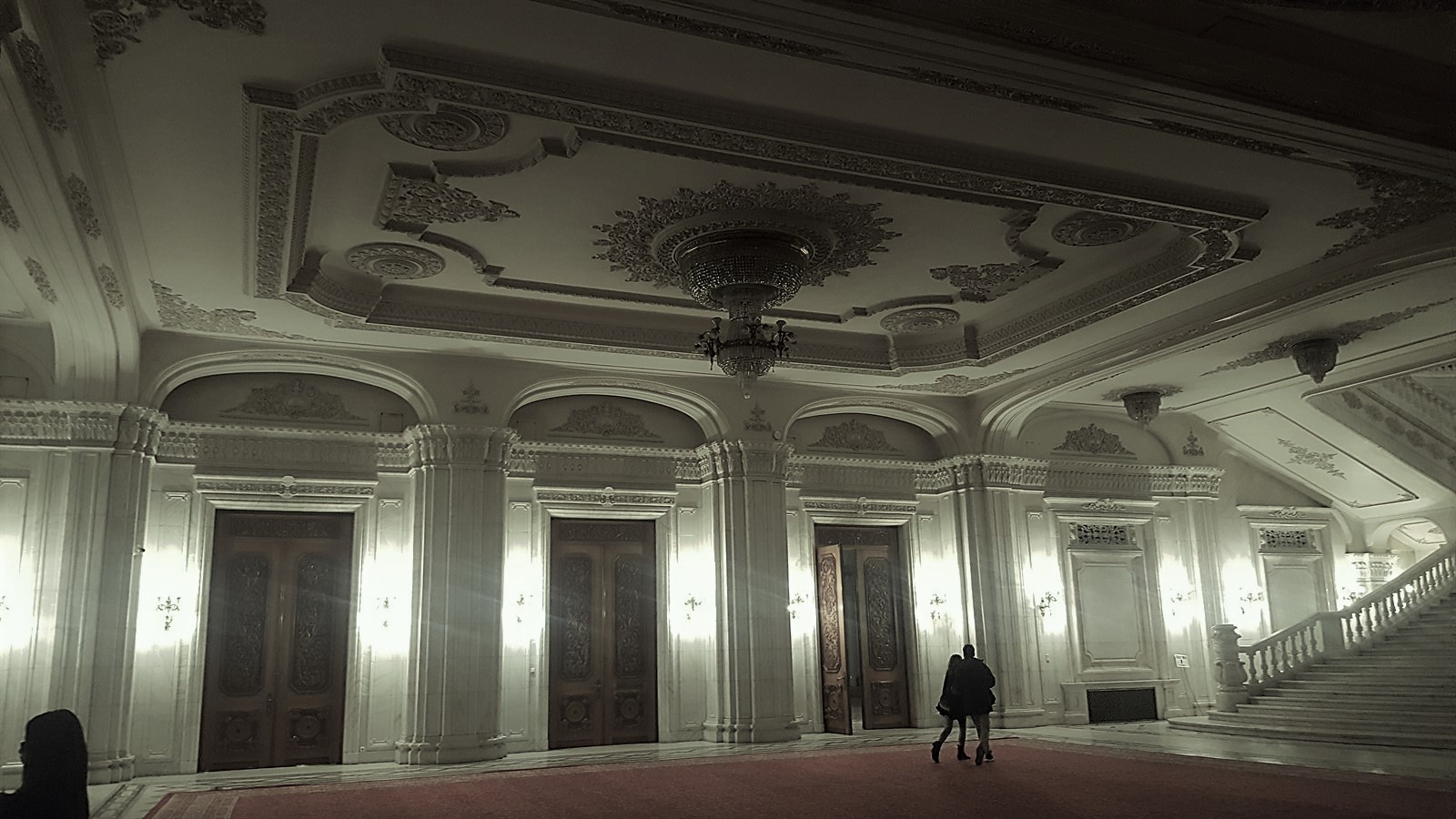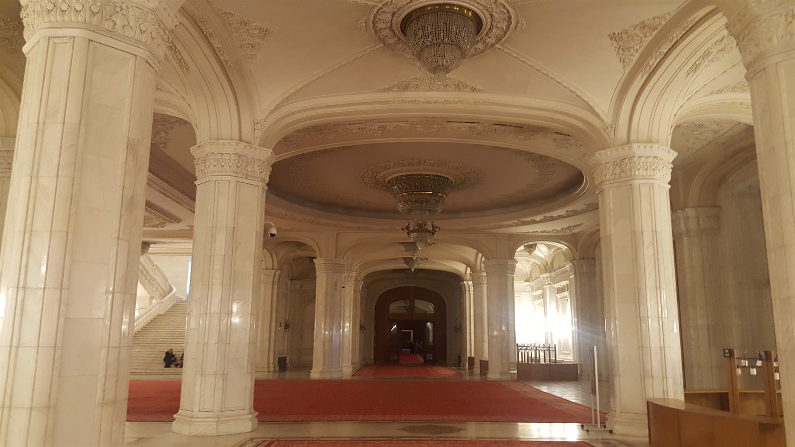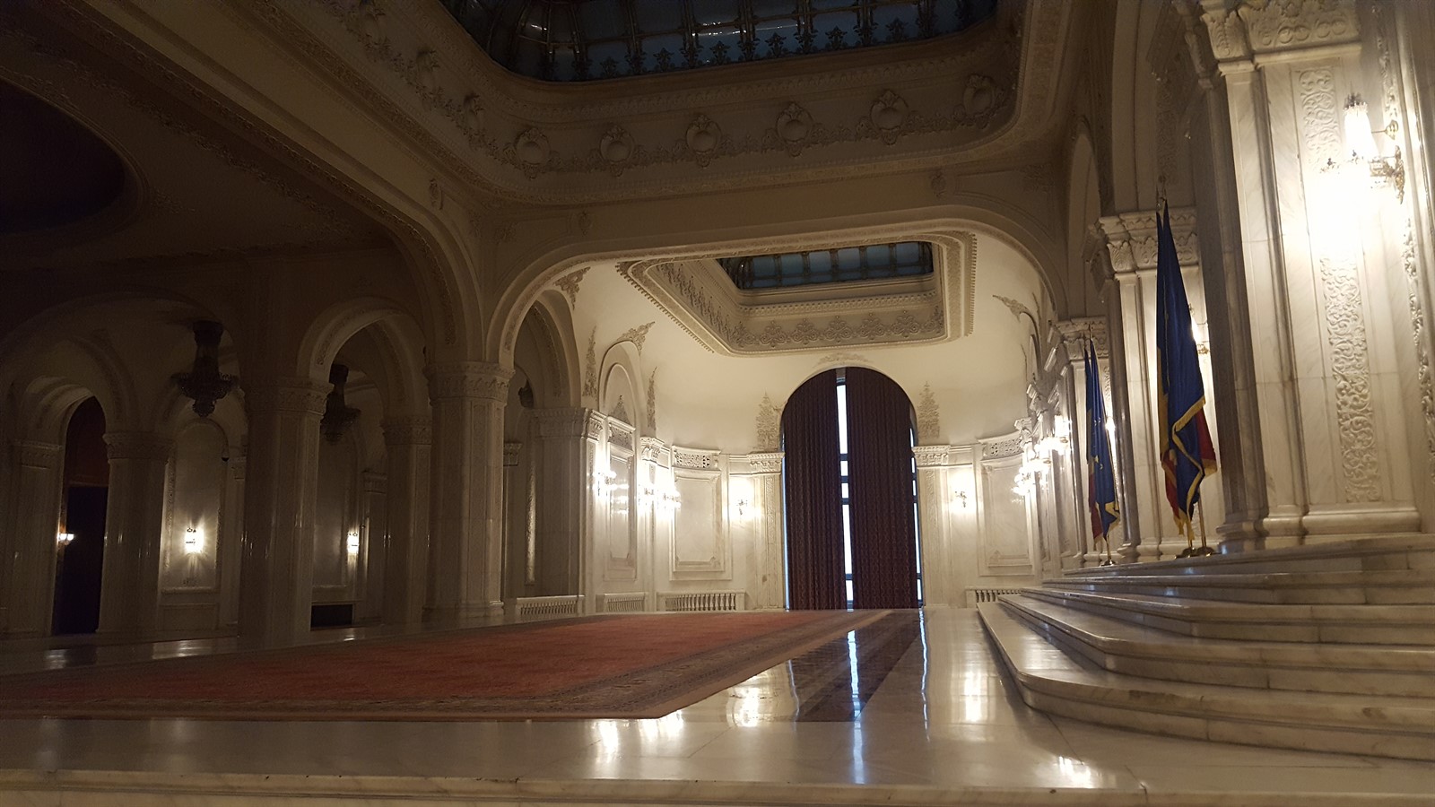 Aici găsim și cele două scări monumentale, fiecare având câte o fereastră de 16m înălțime, acoperite cu draperii enorme, fiecare cântărind peste 250kg. Din spusele domnișoarei ghid, se pare că acestea sunt cele mai înalte draperii din lume, prezente într-o clădire administrativă. Treptele scărilor au o înălțime maximă de 16cm, pentru ca cei doi soți să nu obosească prea tare atunci când urcă. De asemenea se pare că motivul pentru care au fost construite două scări este ca cei doi să coboare simultan, urmând a se întâlni jos.