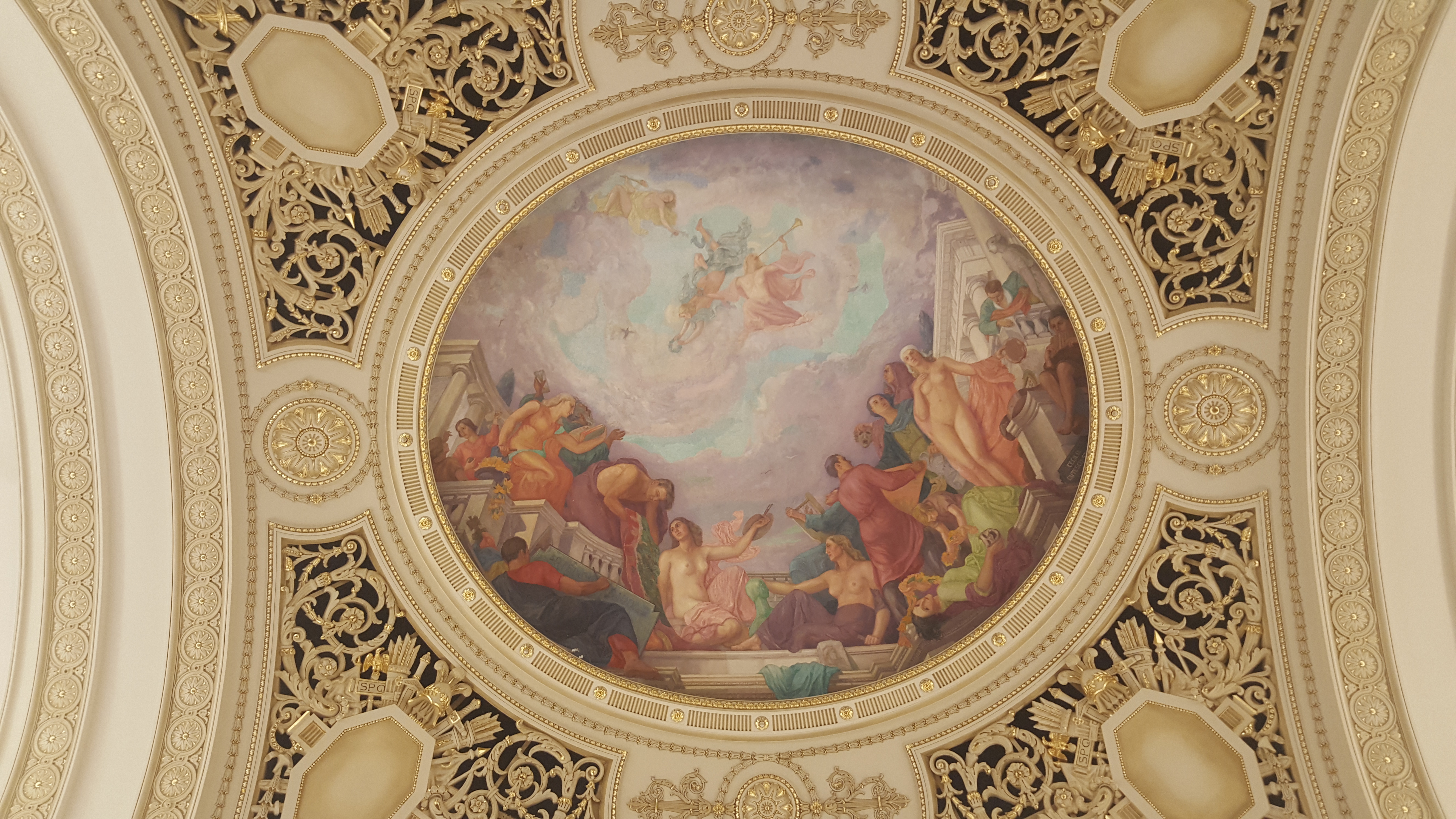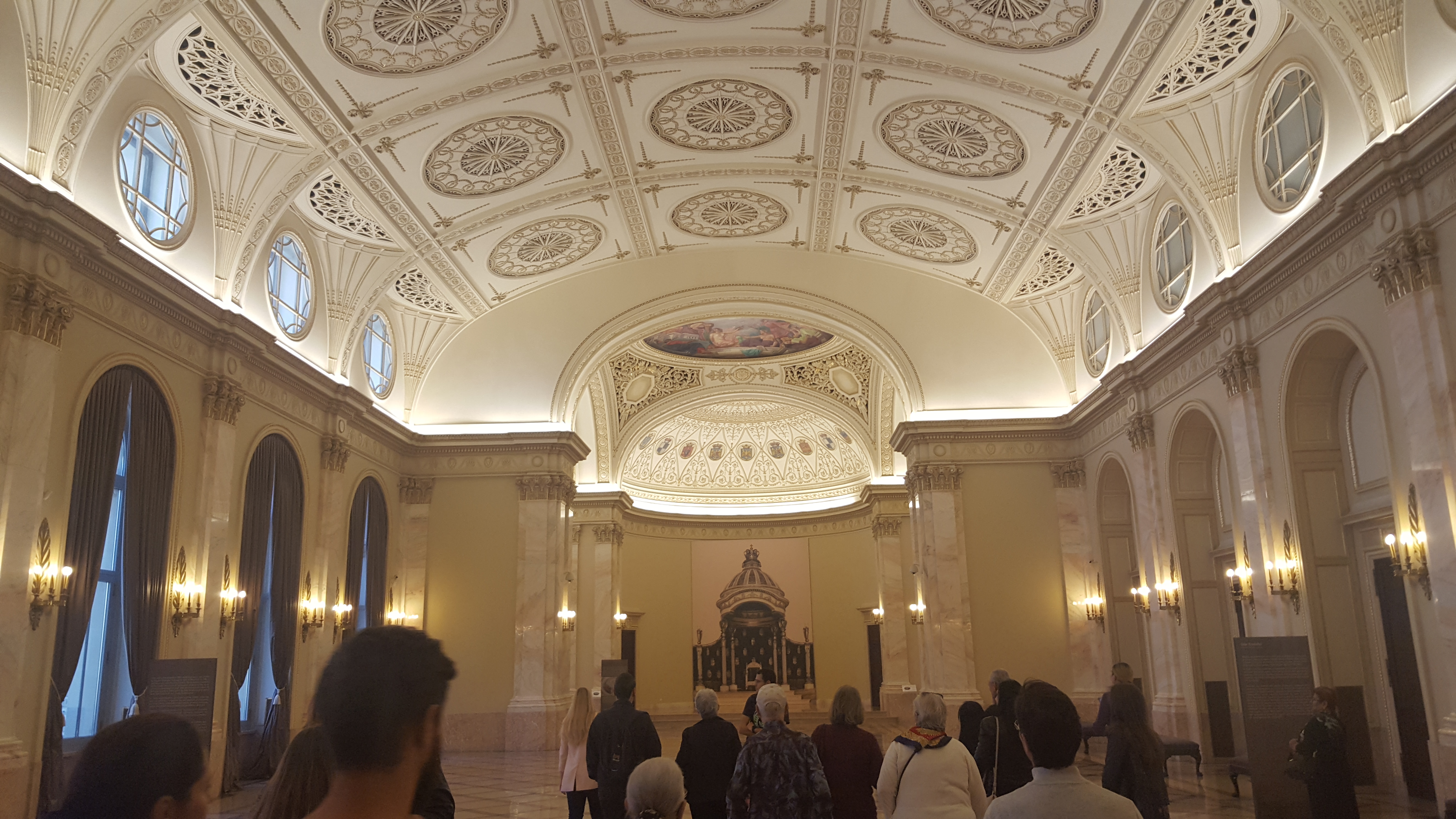Plafonul pare a se sprijini pe o friză cu medalioane în basorelief, realizate după proiectul sculptorului Cornel Medrea. Acestea reprezintp portrete ale unor figuri legendare de domnitori și regi, printre care: Mircea cel Bătrân, Alexandru cel Bun, Vlad Țepeș, Ștefan cel Mare, Matei Basarab etc. Mihai Viteazul, cel care a înfăptuit pentru prima dată Unirea Principatelor, pare că îi privește pe Regii Carol I și Ferdinand, cei care se află lângă zeița războiului, Bellona.
