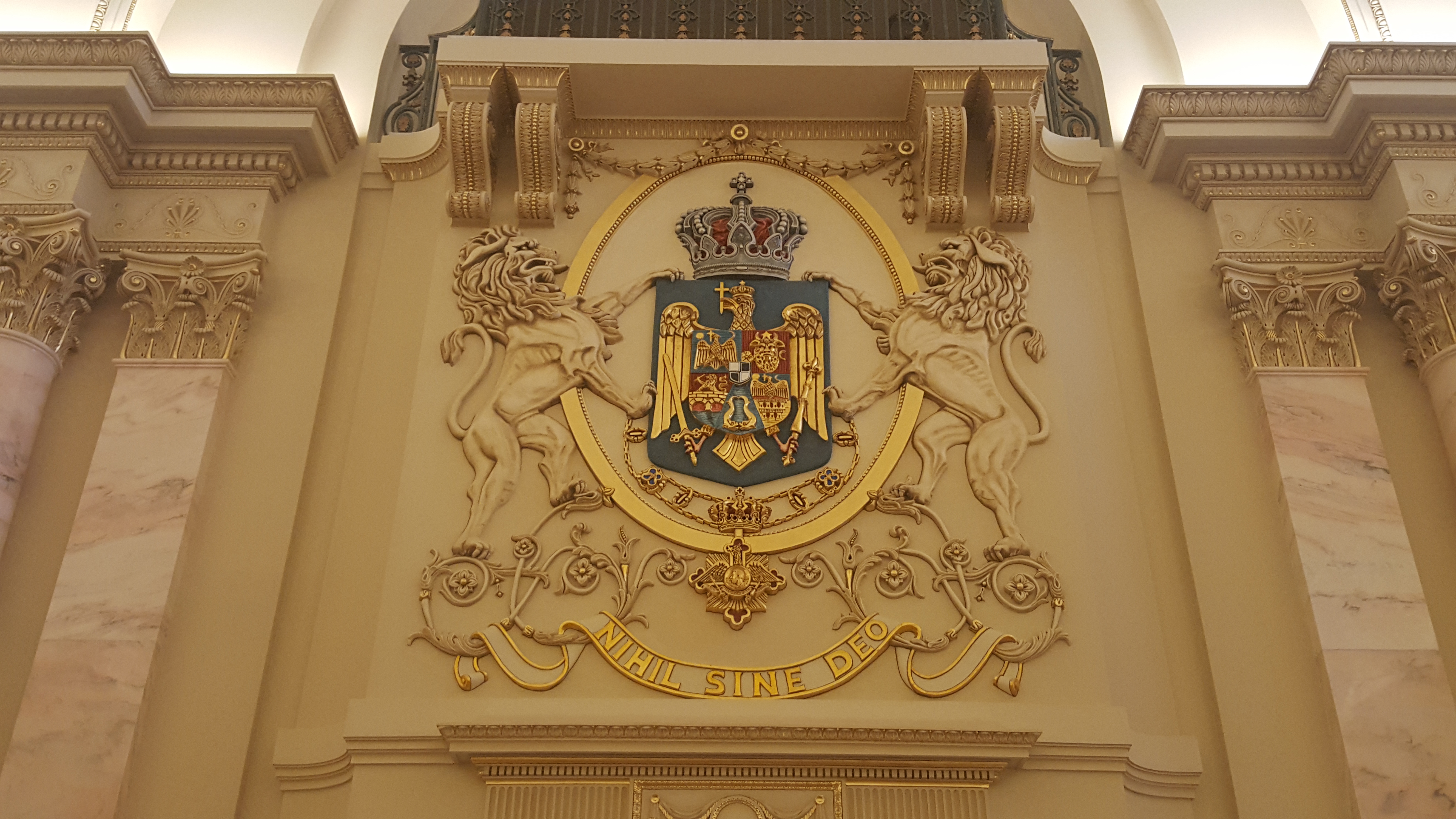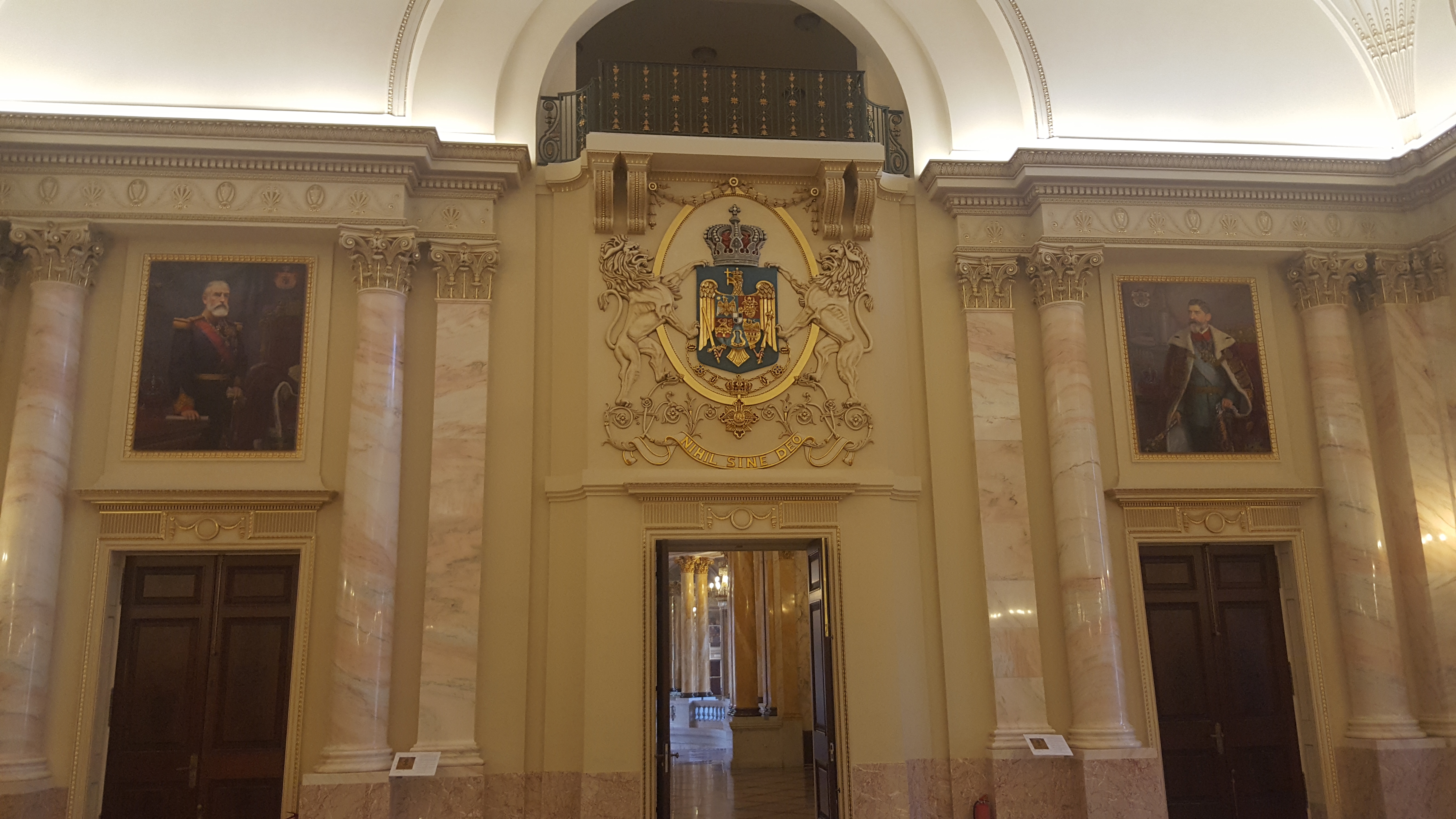 Deasupra ușii puteți vedea stema țării, susținută de lei rampanți și încadrată de portretele regilor Carol I și Ferdinand, pictate de Aurel Bordenache. Pentru că nu am mai văzut Stema Regală a României atât de bine reprezentată, o să îi fac o descriere cât mai completă.