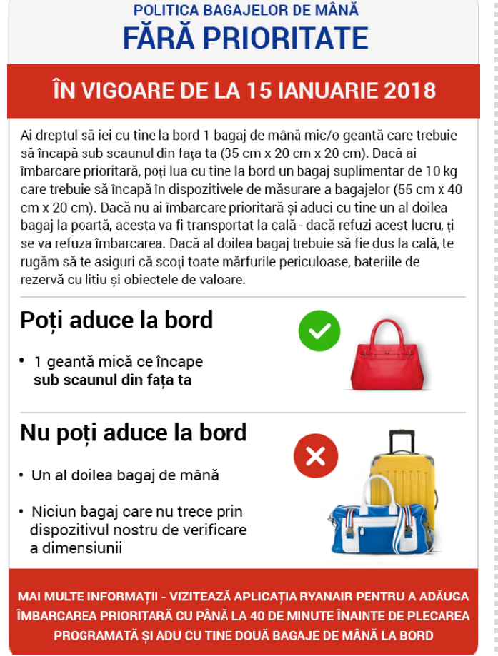 De la finalul anului 2017 compania irlandeză a început să trimită mesaje privind schimbarea politicii bagajelor de mână, începând cu 15 ianuarie 2018!