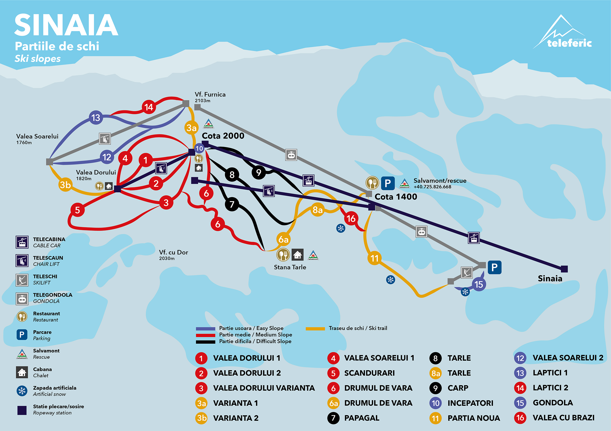 Pârtii: domeniul schiabil din Sinaia este format din 4 pârtii ușoare, 8 medii și 3 pârtii dificile, însumând aproape 17km schiabili. Cea mai lungă ajunge la 2000m.