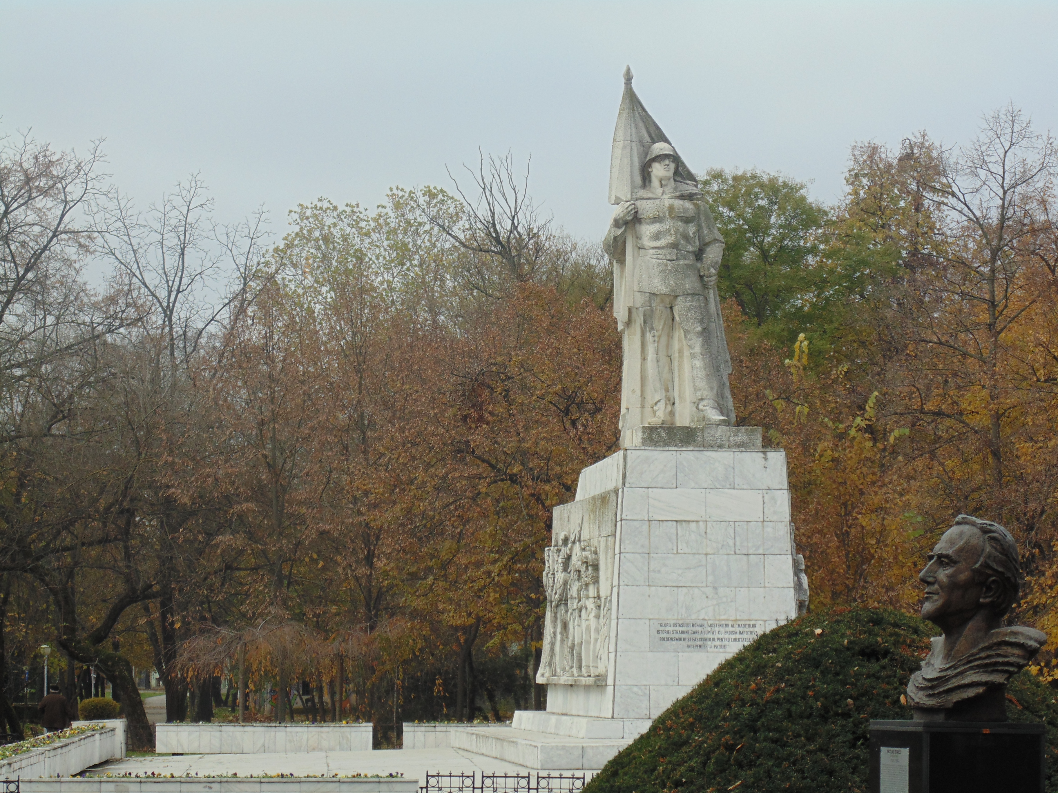 În spatele clădirii se întinde Parcul Catedralei, care nu este cu nimic interesant, iar vizavi este Parcul Central. Aceste două parcuri fac parte dintr-o salbă de parcuri situate pe malul canalului Bega. Nu pot spune că am fost impresionat de ceva anume în scurta plimbare prin parc, de menționat fiind busturile unor personalități locale și naționale și Monumentul Eroilor, dar și cromatica de toamnă oferită de frunzele căzute.