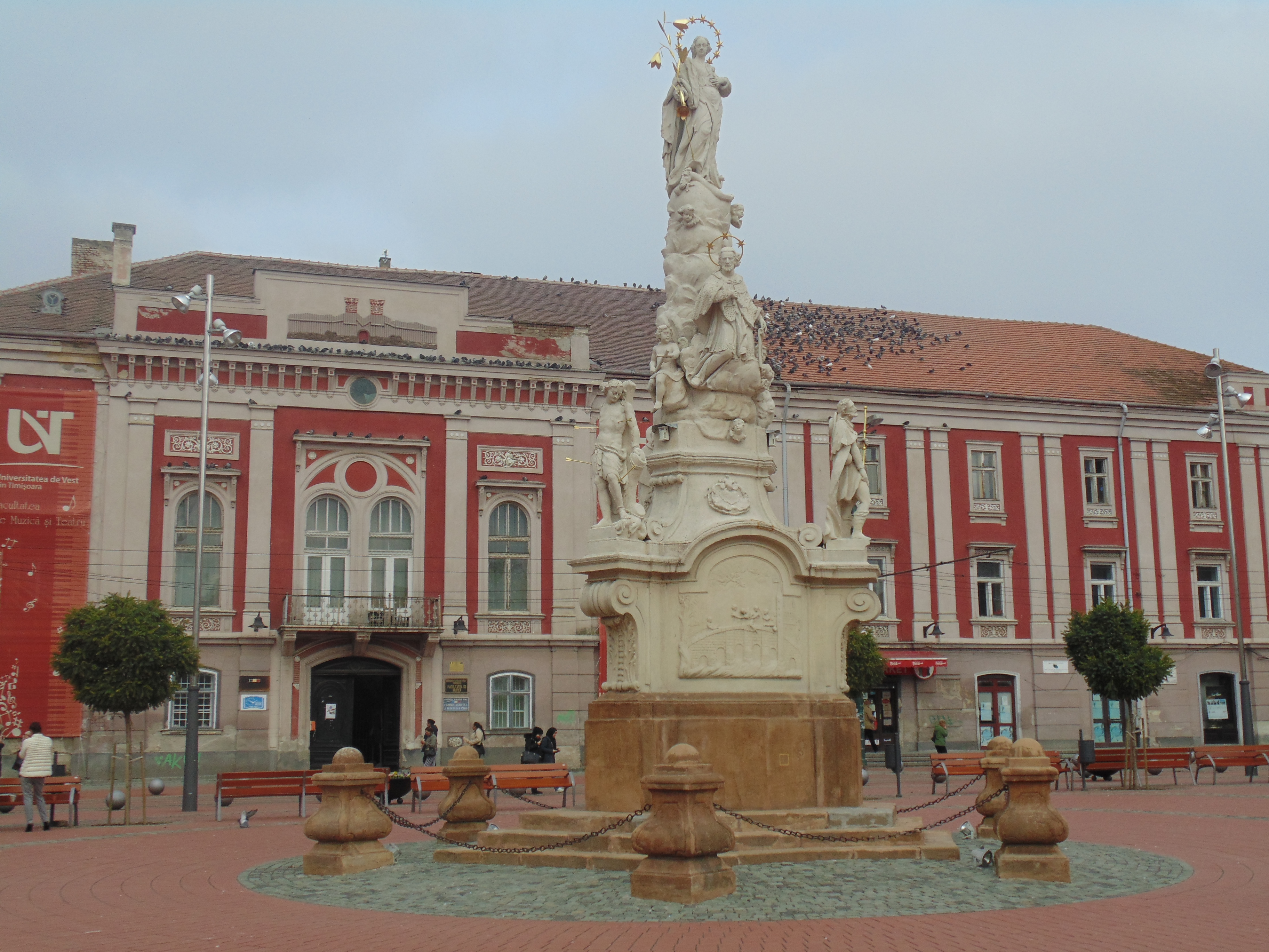 Mai mergem puțin și ajungem la Piața Unirii, în opinia mea cea mai frumoasă din Timișoara. Asemeni unui stadion, atât ca formă dar și ca dimensiuni, are în centru monumentul Sfintei Treimi, specific orașelor baroce. Executată la Viena și adusă până la Timișoara pe cale fluvială, este amplasată pe locul actual din 1740. Piața este flancată de edificii superb restaurate, precum Vicariatul Ortodox Sârb, care datează din 1747 și prezintă decorațiuni în stil tradițional sârb. Imediat lângă acesta se află Catedrala Episcopală Ortodoxă Sârbă , înființată la un an după vicariat.