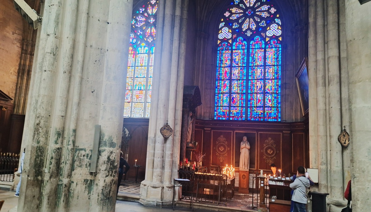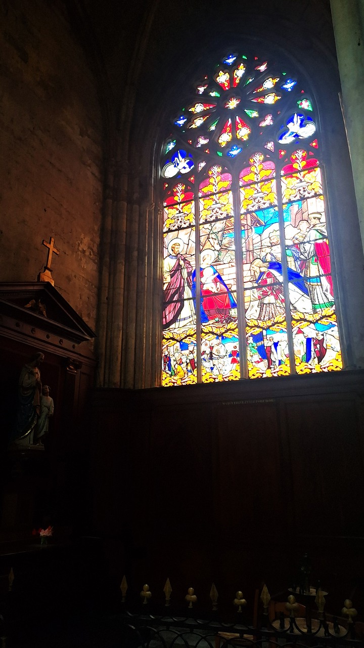 Cele mai vechi, din secolul al XIII-lea, se află în ferestre din cor și reprezintă scene din viața sfinților și din Biblie în culori intense, dominate de albastru și roșu. Rozeta mare de pe fațada vestică, din secolul al XV-lea, înfățișează pe Fecioara Maria înconjurată de îngeri. Când lumina după-amiezii pătrunde prin aceste vitralii, interiorul catedralei se transformă într-un caleidoscop de culori proiectate pe piatră.